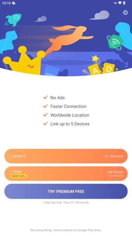 Turbo VPN es gratuito y permite a los usuarios acceder de forma anónima a sitios web bloqueados y a diferentes restricciones geográficas. Su nivel de seguridad de nivel militar ofrece una conexión a internet estable, rápida y fiable, incluso en la versión gratuita. Si quieres más, necesitas la versión premium. Ofrece múltiples funciones avanzadas, como la ausencia de publicidad, túnel dividido, direcciones IP dedicadas, etc. Los planes de precios están disponibles por un mes, seis meses y un año. También puedes usar una sola suscripción en hasta cinco dispositivos.